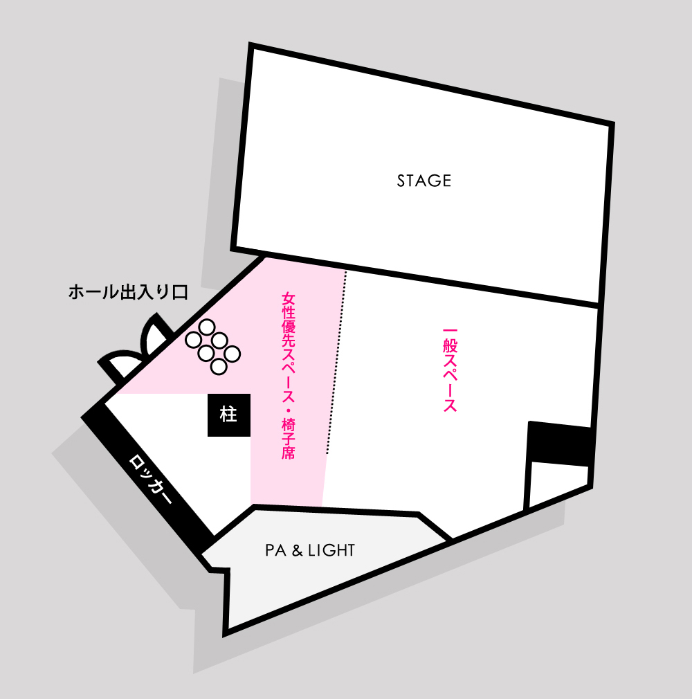 ※女性優先スペースにつきまして※ 客席入り口側を柵で区切り、「女性優先スペース」を設けさせていただきます。 女性でご希望のお客様は、入場の際にこちらへお進み下さい。 ※椅子席につきまして※ 少数ではございますが、入口付近に椅子のお席をご用意致します。 場所、個数等は変更になる場合がございます。 こちらは男女問わず、身体的に長時間のスタンディングライブの観覧が難しいお客様優先でご利用いただきます。 譲り合いの上、ご利用くださいませ。 なお、当日の動員数によっては椅子席からはステージが見えない場合がございます。 申し訳ありませんが、予めご了承くださいませ。 ※椅子席をご希望のお客様へ※ 椅子は数に限りがございます。 着席でのご観覧を必須とされる客様は、前日までに会場までお問い合わせください。 なお、車椅子の補助など上記以外の特別な対応が必要な場合は 会場スタッフでは対応致しかねる可能性がございますので、予めご相談くださいませ。 上記「当日の注意事項」に基き、 会場内外で発生したトラブルに関しては主催者側・会場側は一切責任を負いかねます。 お客様自身の責任においてご来場いただき、くれぐれもご無理のないようご注意ください。